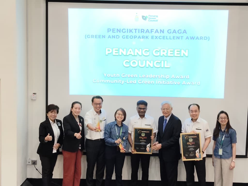 Photo caption: A proud moment for the Penang Green Council (PGC) at the Green and Geopark Excellent Awards ceremony, celebrating leadership and community-driven environmental action. Pictured with the PGC award recipients are, third from the right, KY Pung, GAGA Convenor; fourth from the right, Datuk Seri S. Sundarajoo, Penang State Executive Councillor for Housing and
